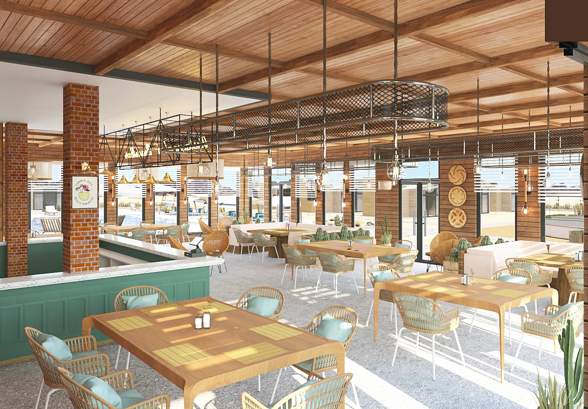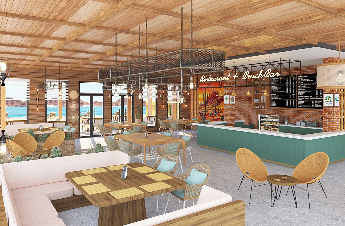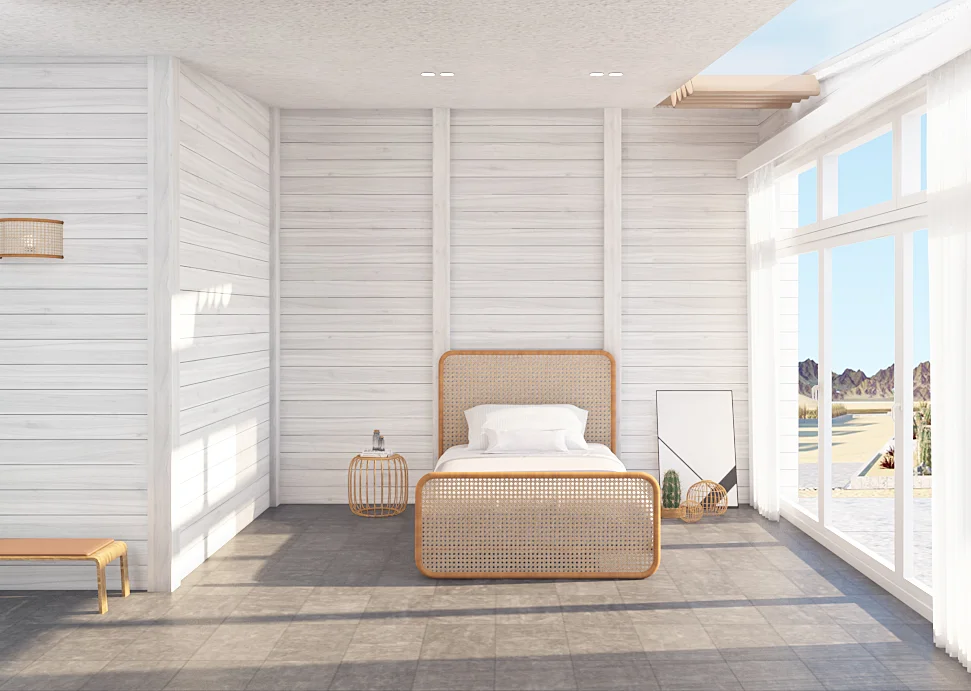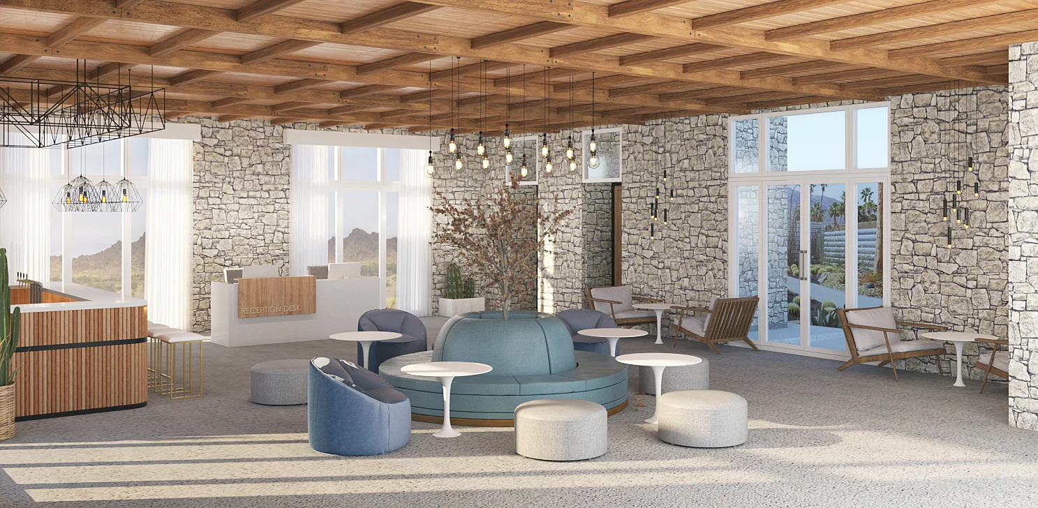 a central pool, and a stone-clad main building. Each piece is crafted to enhance the natural materials and coastal atmosphere, emphasizing simplicity, comfort, and understated elegance.