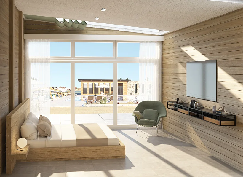 Matarma Hotel features a bespoke furniture collection designed to complement its serene beachfront setting, with minimalist wooden cabins,